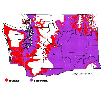 American Goldfinches are common from mid-April to mid-October in appropriate habitat throughout Washington's lowlands. They are generally present in these same areas in winter, but are much less common. They are more common in winter east of the Cascades than west, especially along the Columbia and Snake Rivers. In winter, they are less common along the outer coast than elsewhere in Washington. They breed below 500 feet on the outer coast, below 1,000 feet in the Puget Trough, and below 2,000 feet along major river valleys in northeastern Washington.