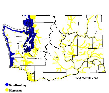 Bonaparte's Gulls are commonly found during the winter in coastal areas throughout Washington, and as migrants in lowlands east and west of the Cascades. During these times they are common in salt-water, sandy-shore, and fresh-water habitats. In winter, large flocks can be found in inner coastal areas, such as the Strait of Juan de Fuca. The mouth of the Columbia River, the Tacoma Narrows, Seattle's Green Lake, and Point No Point (Kitsap County) are all spots where Bonaparte's Gulls can regularly be seen.