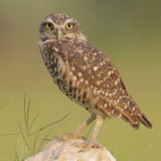 Burrowing Owls are long-legged, ground-dwelling owls. Adults are light brown, mottled with white. They have white throats and eyebrows, and yellow eyes. Immatures are light brown, less distinctively mottled than adults, and have buffy, unstreaked bellies. In contrast to most other owls and almost all other raptor species, females are smaller than males.
