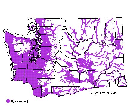 Downy Woodpeckers are common year round in hardwood forests at low to moderate elevations throughout most of Washington. They occur but are relatively uncommon in the Palouse area, where they are generally restricted to streamsides, and in the Columbia Basin east of the Potholes reservoir, although they are fairly common around the Tri-cities.