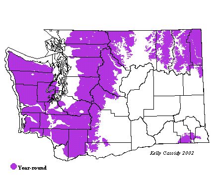 Gray Jays can be found year round at high altitudes (above 3,000 feet) throughout Washington. They can be found locally down to sea level on the outer coast of the Olympic Peninsula and rarely at other spots in western Washington, such as Lewis and Clark State Park, southeast of Chehalis (Lewis County) and the Willapa Hills (Pacific County). They are very uncommon at Fort Lewis (Pierce County).