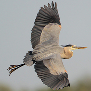 The familiar Great Blue Heron is the largest heron in North America. It is a large bird, with a slate-gray body, chestnut and black accents, and very long legs and neck. In flight, it looks enormous, with a six-foot wingspan. Adults sport a shaggy ruff at the base of their necks. A black eyebrow extends back to black plumes emerging from the head. Juveniles have a dark crown with no plumes or ruff, and a mottled neck. In flight, a Great Blue Heron typically holds its head in toward its body with its neck bent.