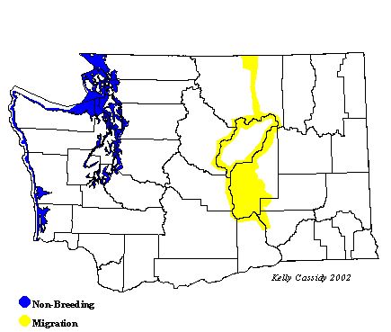 In Washington from mid-October to early May, Long-tailed Ducks are usually found in deep salt water, sometimes intermingled with scoters. They are common on the coast and in north Puget Sound, and are less common in the southern end of the sound. Large flocks can often be observed off Point Roberts and in Bellingham Bay. They have also been seen on ponds and lakes in eastern Washington and in the Okanogan Valley.