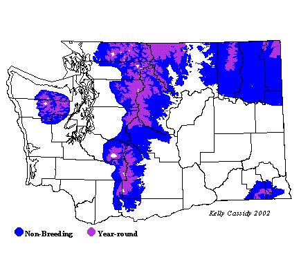 Pine Grosbeaks are uncommon to rare year round in the mountains of Washington, and rare in the lowlands on both sides of the Cascades in winter. They breed locally along the length of the Cascades, in the Olympics, the Blue Mountains, and in northeastern Washington, typically over 3,000-4,000 feet. They become more common as you go east in Washington, with the exception of the Blue Mountains, where they are quite uncommon.
