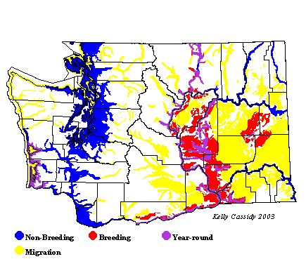 The Ring-billed Gull is common in eastern Washington, breeding colonially on gravel islands in lakes and rivers, and feeding in agricultural fields, cities, and wetlands near the breeding colonies. In western Washington, they are locally common on the dredge-spoil islands in Grays Harbor and Willapa Bay. Non-breeders are also abundant in western Washington in the summer. Migrants have been observed at fairly high elevations in the Cascades. In winter, they are common in coastal areas and the Puget Trough, and are fairly common in eastern Washington in the Columbia Basin, although they are less common here in severe winters.