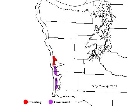 Three areas, Leadbetter Point (Pacific County), Midway Beach (Pacific County), and Damon Point (Grays Harbor County), currently support breeding populations of nesting Snowy Plovers. Damon Point is this species' northernmost nesting area along the Pacific coast. Wintering birds may be found at these same locations. Snowy Plovers are rare vagrants to eastern Washington in April and May.