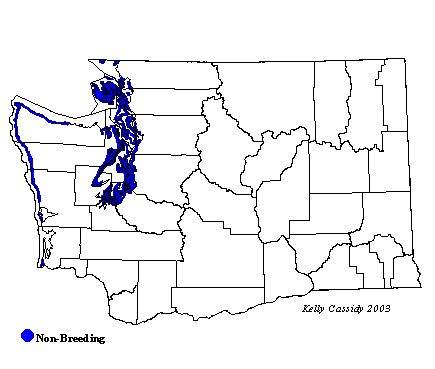 Surfbirds may be present on Washington's outer coast in all months, although they are least common in June. The earliest returning migrants may arrive at the end of June, but most start to arrive in July. They are common from July to April, when they start migrating north for the breeding season. By the end of May into early June, they are rare in Washington. The northward migration peaks from mid-April to early May, and the fall migration peaks in August. Juveniles usually arrive about a month later than adults. They are uncommon in the protected waters of Puget Sound, but can often be seen at Penn Cove on Whidbey Island (Island County) and Duwamish Head in West Seattle (King County). There are typically many Surfbirds on the jetty at Ocean Shores (Grays Harbor County), which is one of the few places where Surfbirds are generally more common than Black Turnstones.