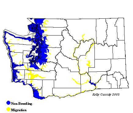 Thayer's Gulls are regular migrants and winter residents in Washington from October to March in offshore, coastal, and the Puget Trough regions. They are uncommon in April and early May, and are usually absent from mid-May until September. In winter, they can also be seen around the lower Columbia River and the Willamette Valley. The Port of Tacoma area and Ediz Hook at Port Angeles are excellent places to look for Thayer's Gulls. Agricultural areas and garbage dumps are good inland spots to look for them. In late February and early March, hundreds are attracted to the smelt runs on the lower Columbia River.