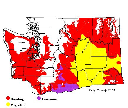 Western Bluebirds can be found in eastern Washington at the edges where the forest meets the steppe. They are also found in open coniferous forest, especially Ponderosa pine. They are especially common in areas where nest box projects have provided them with adequate cavities. Nest boxes are in place in Kittitas, Yakima, Klickitat, Walla Walla, Columbia, and Garfield Counties. In western Washington, Western Bluebirds are now regular, but uncommon, in the Fort Lewis area, and rare in forest clearings in King, Pierce, Thurston, and Mason Counties, and in prairie areas near Port Townsend (Jefferson County), at the mouth of the Naselle River (Pacific County), Forks (Clallam County), and other sites on the eastern Olympic Peninsula. They can also be found year round in Skamania County.