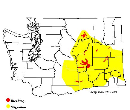During the breeding season, Black-necked Stilts are scattered in small colonies from Potholes Reservoir in central Washington north to Okanogan County. They are occasionally seen in western Washington in spring (April to May), rarely in early August.