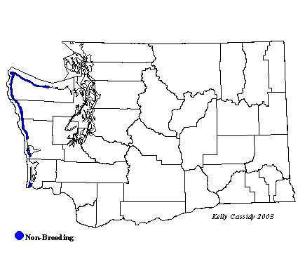 The Rock Sandpiper is an uncommon species found on jetties (such as the jetty at Ocean Shores) and the rocky shores of coastal Washington from October to mid-May. Rarely, a few birds are seen at either end of that time period, as early as August, and as late as the end of May. Rarely, birds are seen in protected waters, south into Puget Sound as far as Seattle. They have not been recorded in eastern Washington.