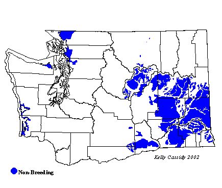 A winter visitor to Washington, the Snow Bunting is seen from Mid-October through March. They are found in open areas of central and eastern Washington, and can often be seen along US Route 2. Along the coast they can be seen in open dunes and grassy areas. They can occasionally be seen in the Puget Trough, rarely in Seattle, and more often in the northern Sound by Bellingham.
