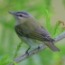 This family is found only in the New World. Vireos are small birds that move about slowly and deliberately as they glean insects from foliage and twigs. Their bills are cylindrical, with a slight hook at the end. These bills are relatively large for birds their size, which enables them to eat fairly large insects. Most vireos are drab colored, with olive-green or yellow upperparts and lighter olive or buffy underparts. Many have eye-rings, eye-lines, or wing-bars. In Washington, vireos with wing-bars have eye-rings, and those without wing-bars have eye-lines. Vireos are often hard to see as they forage in high or thick foliage, and when found are generally alone or in pairs rather than in large flocks. Most have fairly simple songs that they sing repeatedly, many singing through the entire day and even while on the nest. Nests are generally suspended from small horizontally forked branches. Pairs are monogamous, and both parents raise the young.